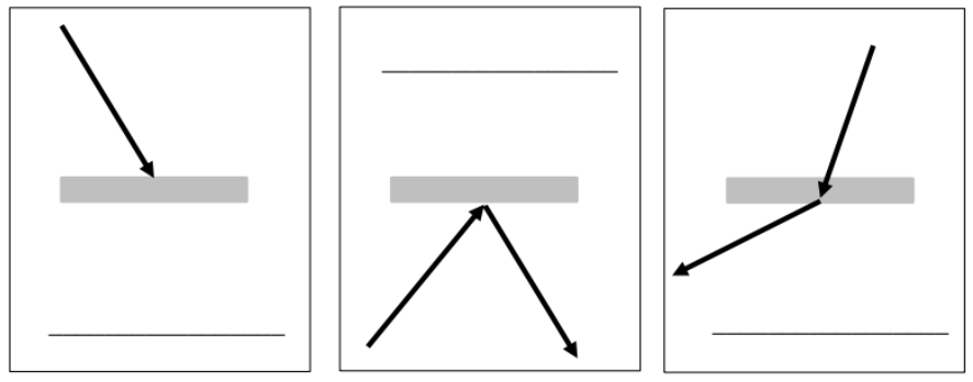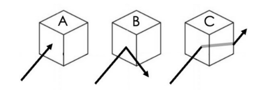 The arrows represent light rays. Drag and drop the words that correctly describes what happens to the light as it strikes each cube.