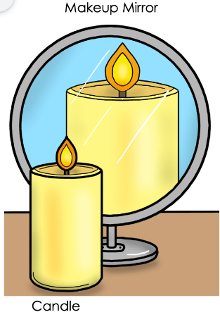 A teacher demonstrated the behavior of light. She set up a lit candle in front of a curved makeup mirror. The candle appeared larger than it actually is.