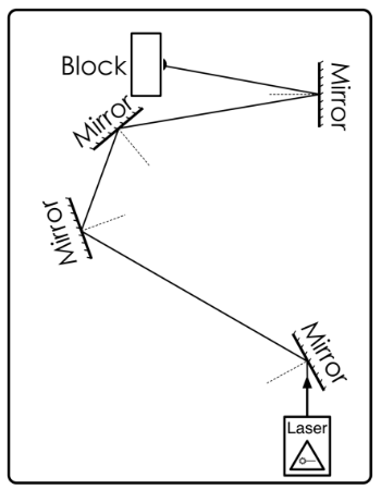 A teacher set up 4 mirrors, a laser, and a block. The light from the laser hits the block because light –