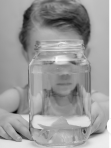 The photograph shows a child with a jar of water holding a fish.