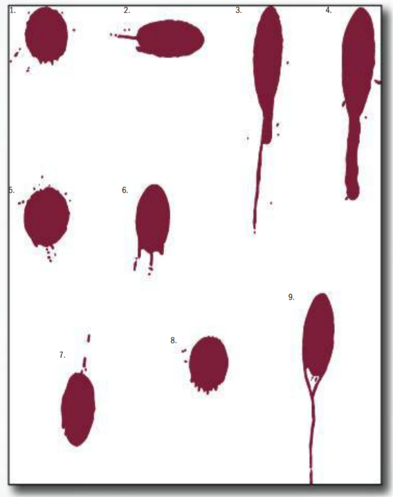 Blood drops 1-3 in the crime scene are impact blood droplets. The area of convergence for blood drops 1-3 are area X1, X2, and X3, respectively. Below are the actual blood drops. You will need to determine the angle at which the blood fell.