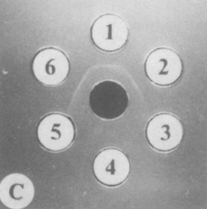 Select the following antiserums that show a positive reaction with the substance being tested in the middle well.