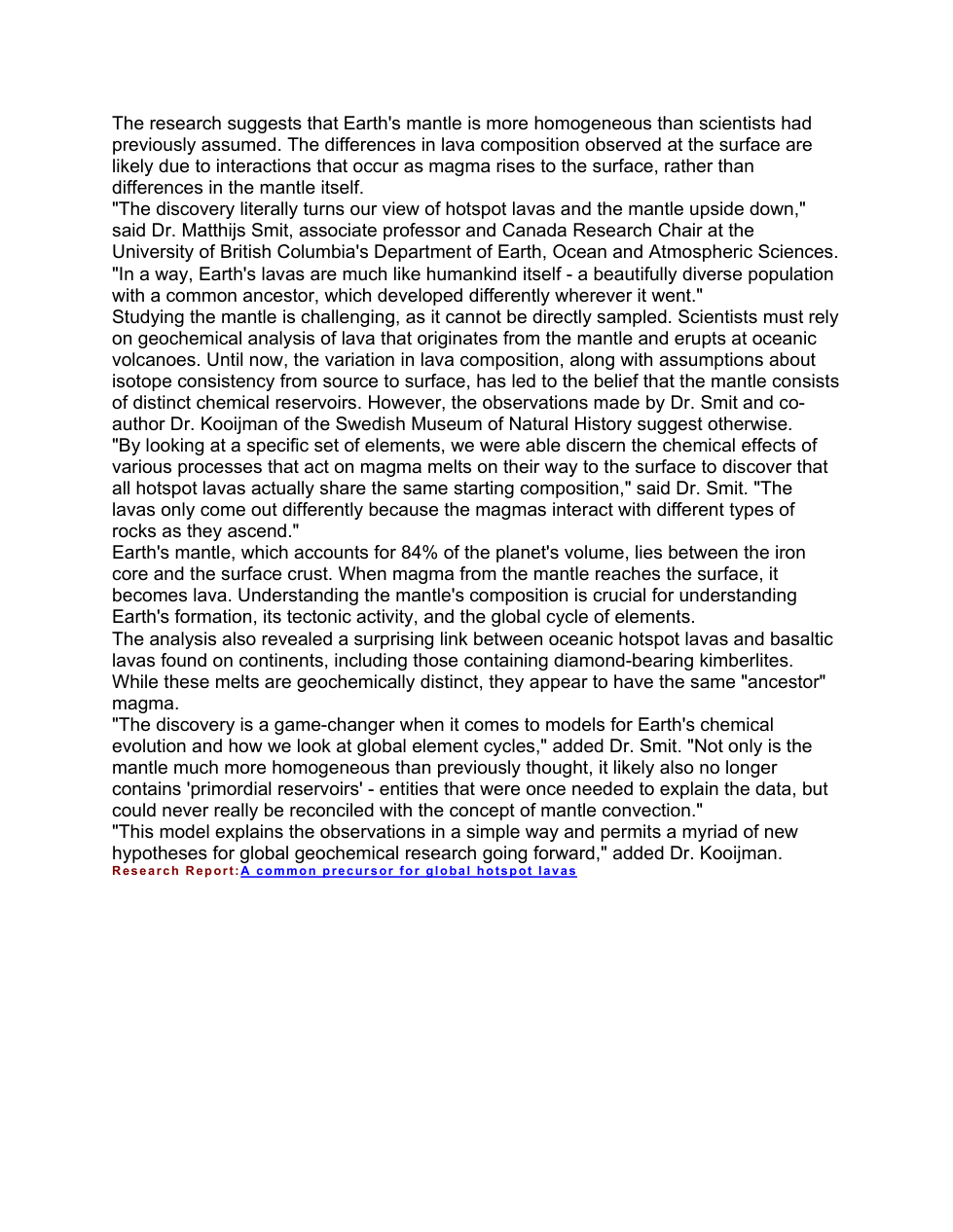 Discuss the significance of the research findings reported in 'Nature Geoscience' regarding the origin of lavas from volcanic hotspots. Which theory does the evidence summarized in the paper support?