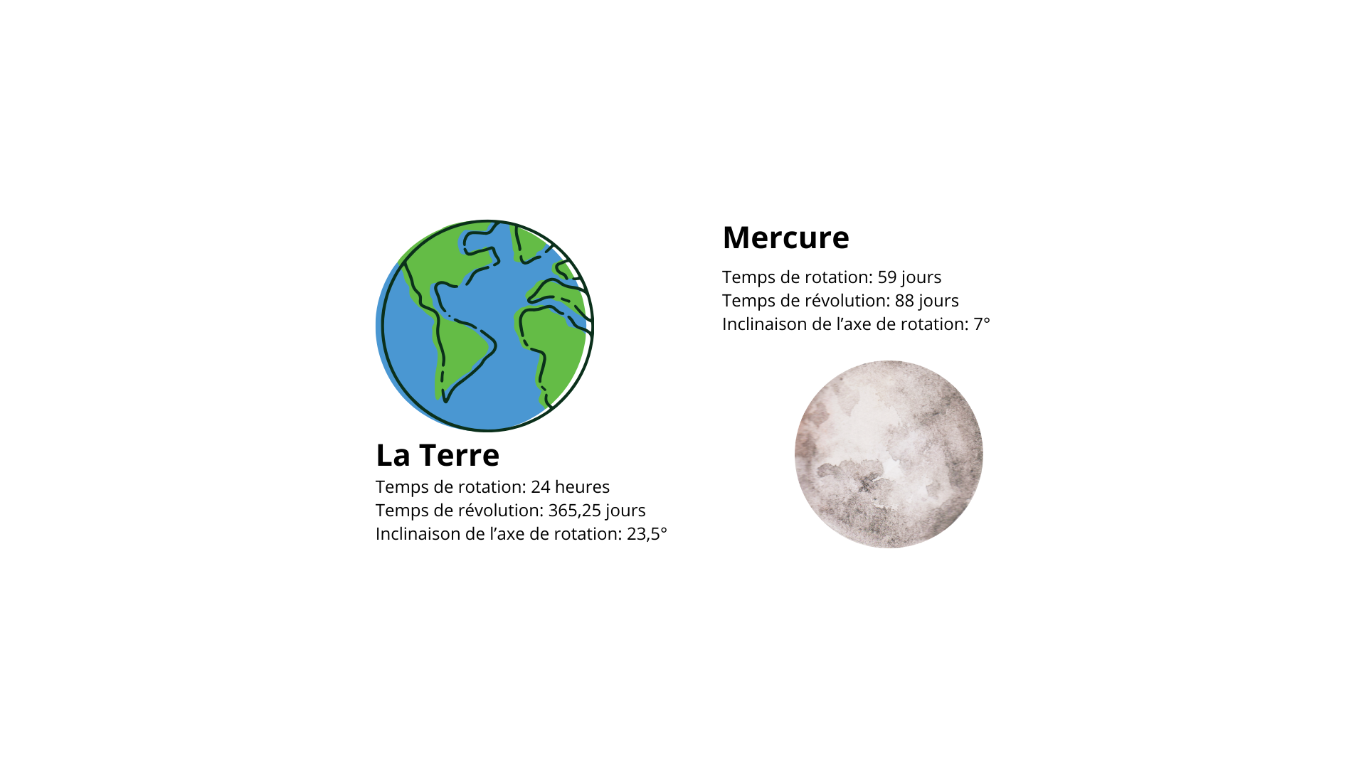 Le phénomène des saisons est causé par _______ . Pour la Terre, les saisons ont une durée de _______ , alors que sur Mercure, les saisons ont une durée de _______ . Les écarts de temps de luminosité entre l'été et l'hiver sont plus important sur la planète _______ car l'inclinaison de son axe de rotation est _______ que celui de l'autre planète.