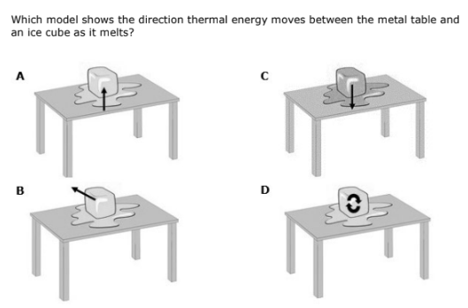 Which model shows the direction thermal energy moves between the metal table and an ice cube as it melts?