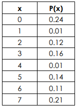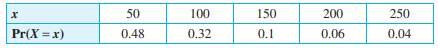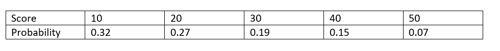 Ana is a dedicated Skee Ball player who always rolls for the 50-point slot. The probability distribution of Ana's score X on a randomly selected roll of the ball is shown here.