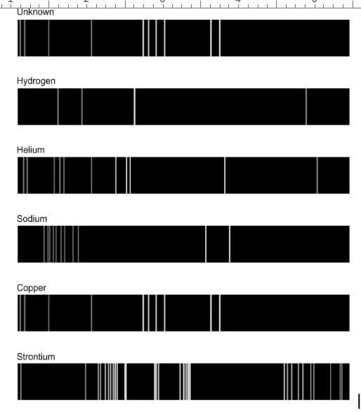 A chemistry graduate student is very skilled at analyzing atomic emission spectra. The print out of her spectrum is printed in black and white. Therefore she has to rely on comparing the widths and positions of spectral lines during analysis. Observe the various atomic emission spectra.