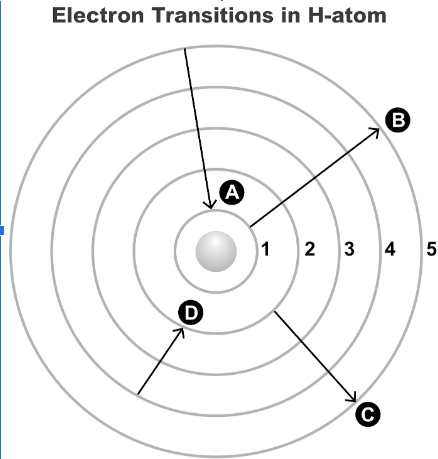 The figure above shows different possible transitions of electrons as they move from higher energy states to lower energy states. Which transition will produce the spectrum line with the shortest wavelength in this element’s atomic spectrum?