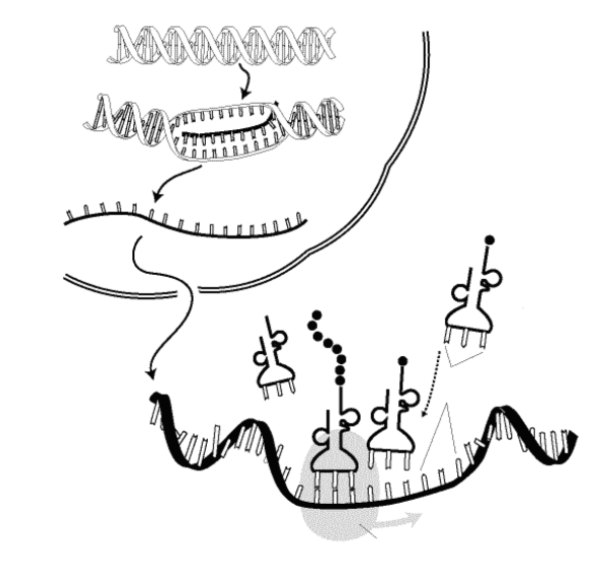 Protein synthesis is the process where a sequence of DNA is used to build a protein from individual amino acids. The first step in this process is called TRANSCRIPTION, where a coding region of DNA is converted to messenger RNA (mRNA). During transcription, mRNA is made from the DNA sequence following the base pair rule, except RNA does not contain the base Thymine, but instead has Uracil. The mRNA then leaves the nucleus and goes to a ribosome in the cell's cytoplasm. The ribosome reads the message three bases at a time, called a CODON. Each codon will specify a single amino acid. The amino acids are joined together and folded into a protein, a process called TRANSLATION