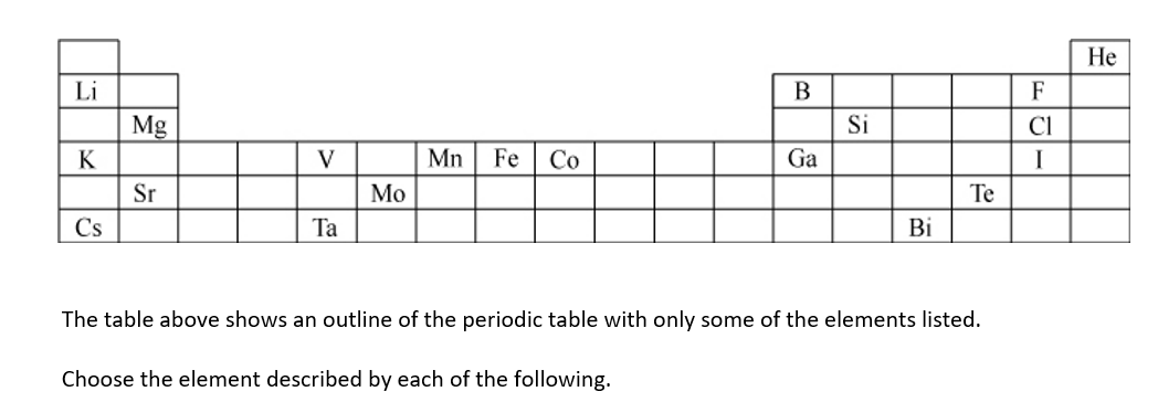 Refer to the above table.Choose the element described by each of the following.(Each element can be selected only once.)