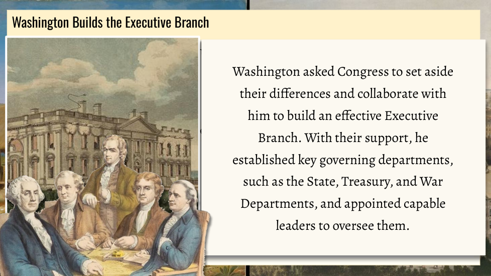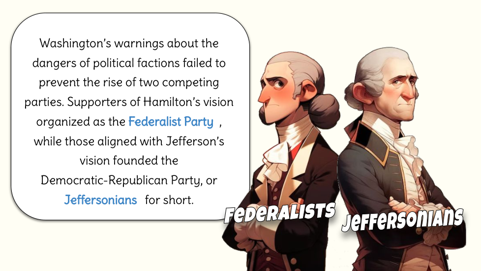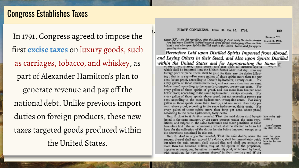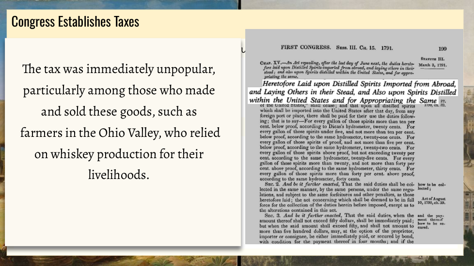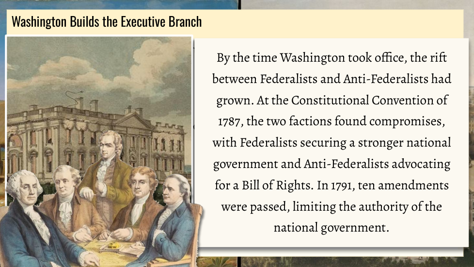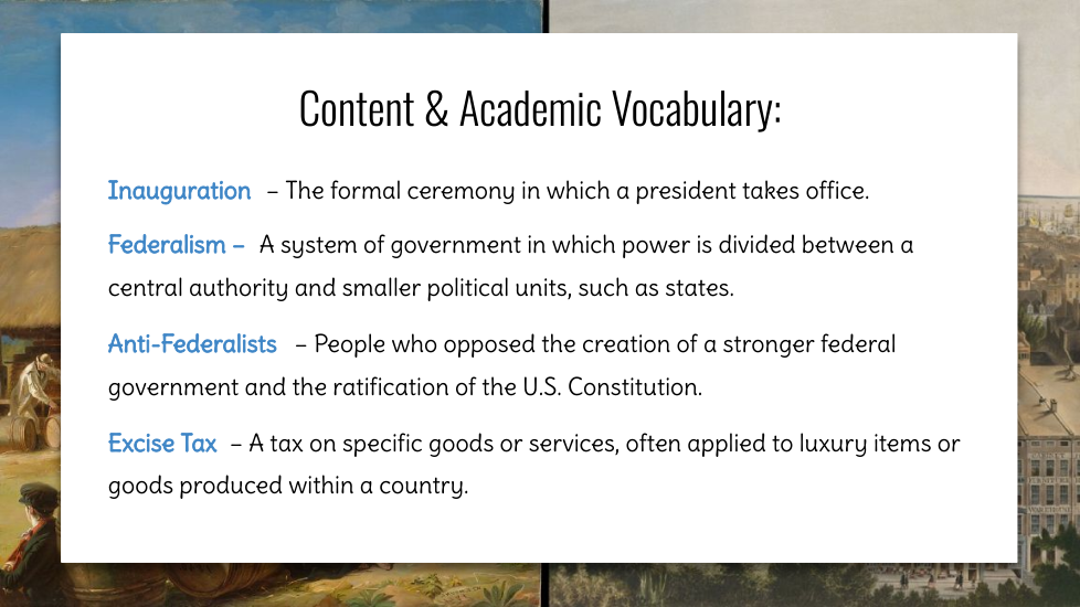 Wtudents explore the key political events and challenges that shaped the early years of the United States under President George Washington. Topics include the formation of political parties, the debate over a national bank, the implementation of excise taxes, and the Whiskey Rebellion. Through an examination of Washington’s leadership and the competing visions of Thomas Jefferson and Alexander Hamilton, students will gain an understanding of how these events influenced the nation's political development.