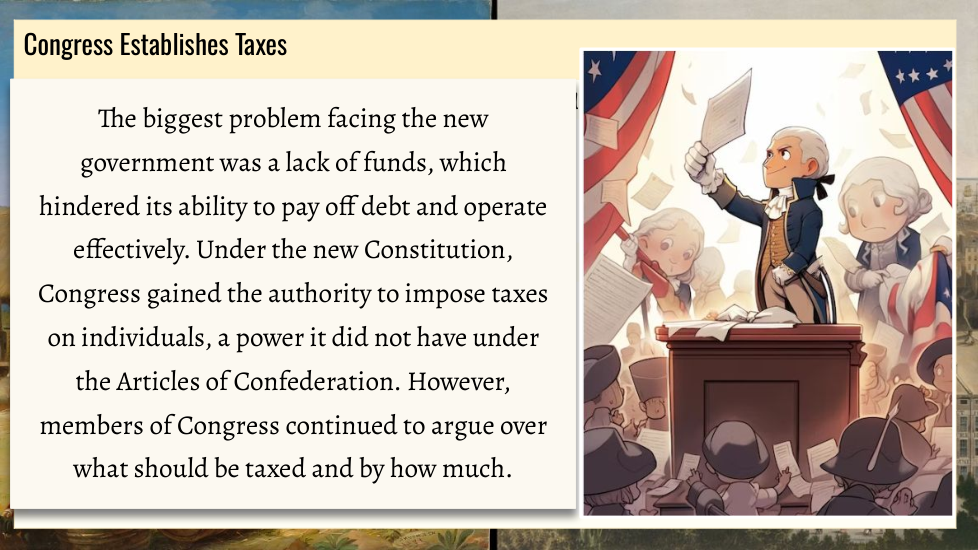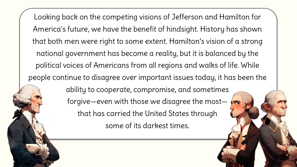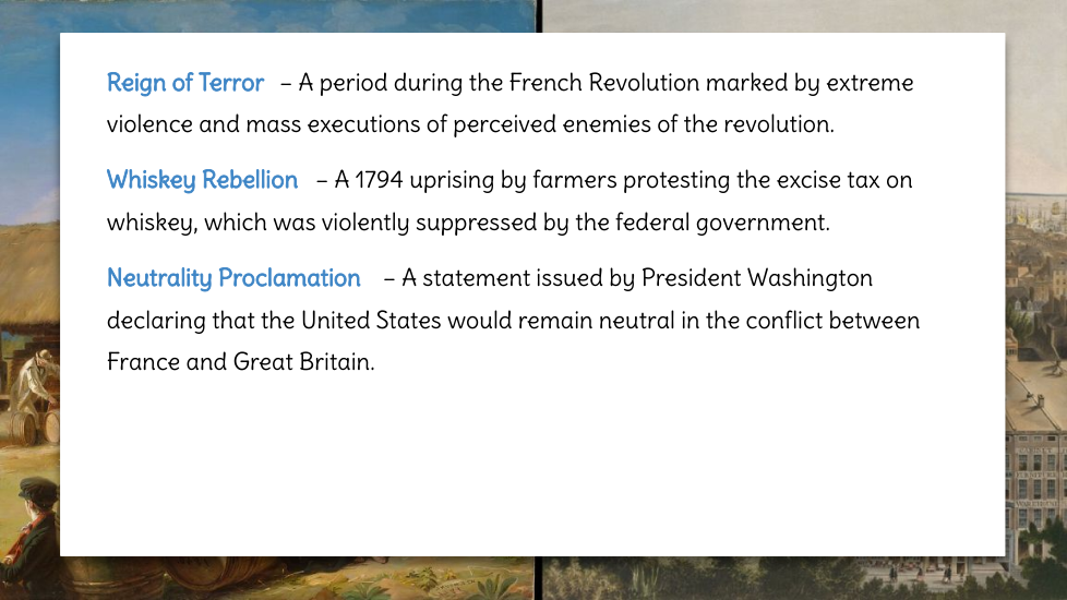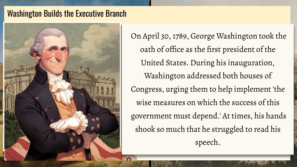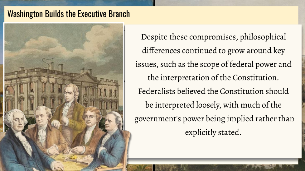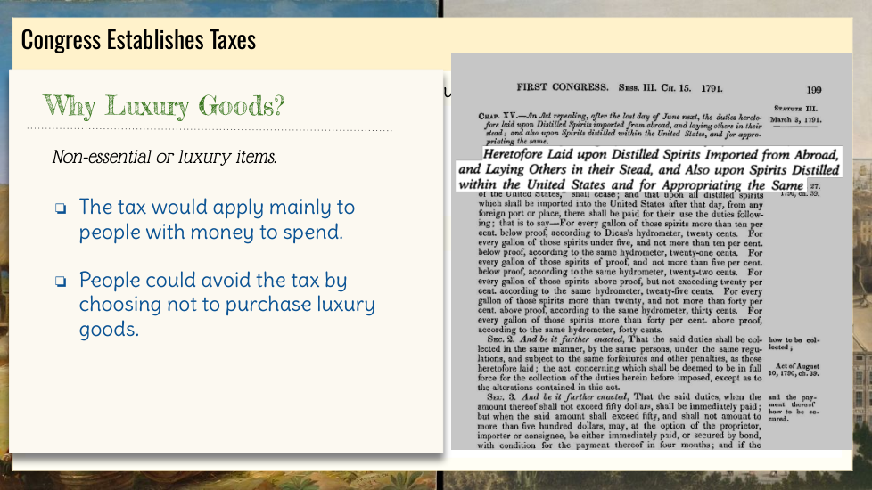 Wtudents explore the key political events and challenges that shaped the early years of the United States under President George Washington. Topics include the formation of political parties, the debate over a national bank, the implementation of excise taxes, and the Whiskey Rebellion. Through an examination of Washington’s leadership and the competing visions of Thomas Jefferson and Alexander Hamilton, students will gain an understanding of how these events influenced the nation's political development.