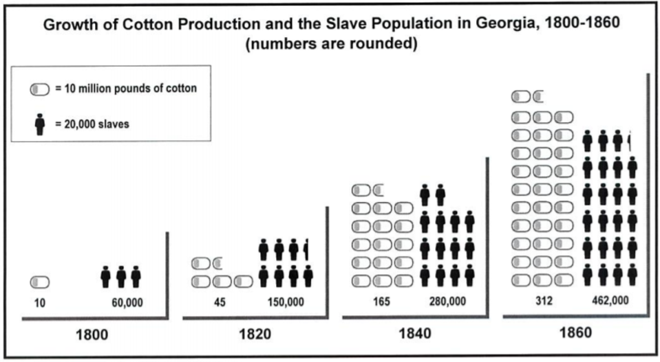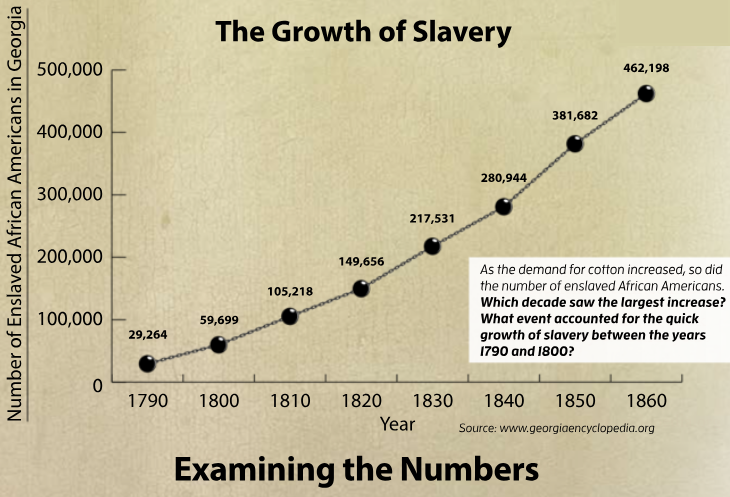Planters did not have enough workers to plant and pick cotton fast enough. The demand for cotton had created a demand for farm labor. To keep their costs down and their profits up, planters used the unpaid labor of enslaved Africans. They saw this as key to maximizing their profits. As the cotton fields expanded, so did the enslaved population. By 1860, enslaved Africans comprised 44 percent of Georgia’s population. The total number that year was more than any other state in the lower South.