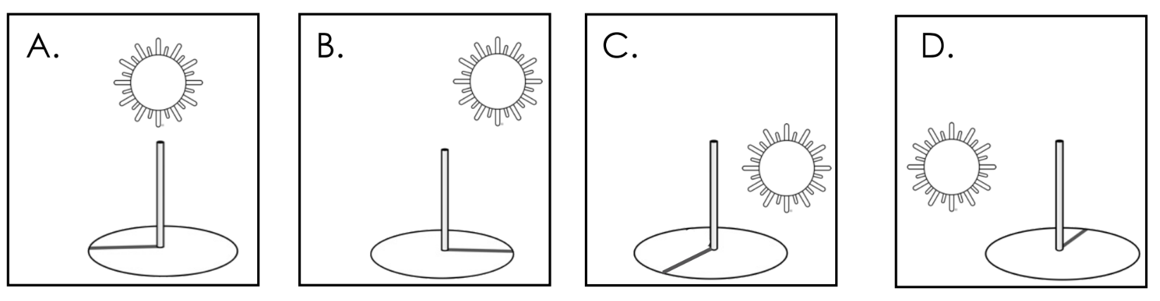 Which image best represents the sundial’s shadow at the position of the Sun shown?