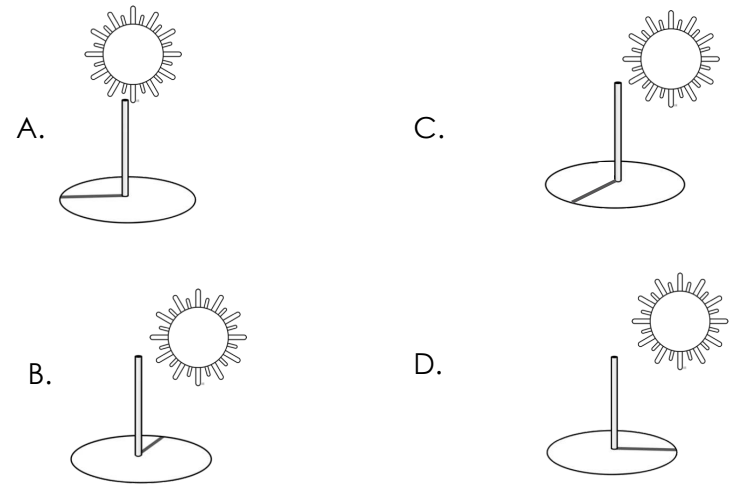 Which picture best represents the sundial’s shadow at the position of the Sun shown?