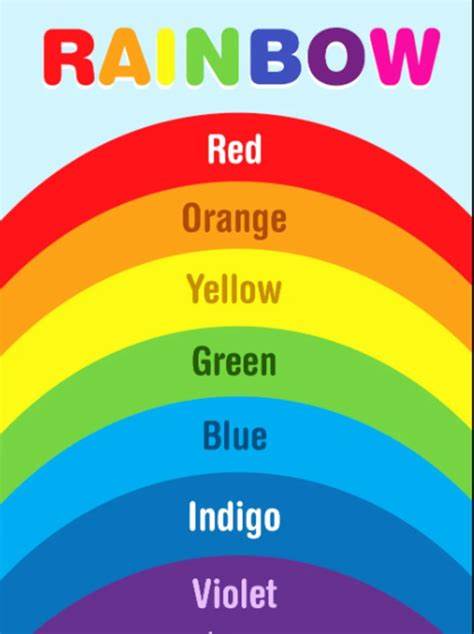 The rainbow has seven main colors: red, orange, yellow, green, blue, indigo, and violet. These colors are always in the same order. Sometimes, you can see a double rainbow with a second, lighter arc above the first one.