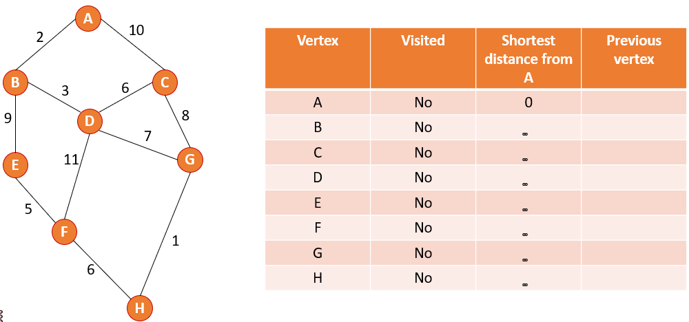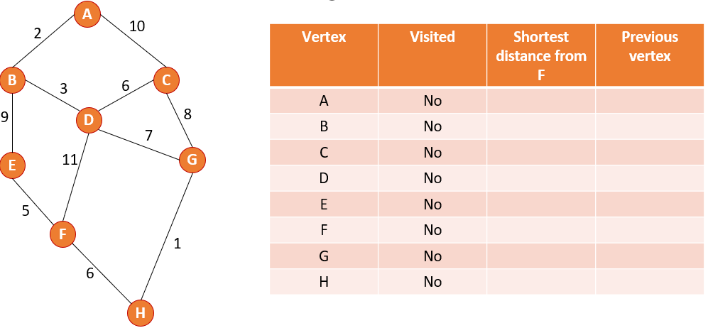 Using Dijkstra’s shortest path algorithm complete the table to show the shortest path from A to H.