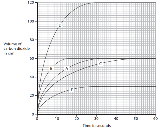The graph shows the volumes of carbon dioxide given off when marble chips are reacted with hydrochloric acid in five different experiments.Curve A shows the volume of carbon dioxide given off when some marble chips are reacted with an excess of 1.0 mol/dm3 hydrochloric acid.Explain which curve, B, C, D or E, could represent the results obtained if half the mass of marble chips is used with excess of the acid.