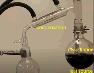 Mixtures can be separated by physical and chemical properties. In distillation, a mixture is heated and the temperature is monitored. As a substance reaches its boiling point, it will evaporate and turn into steam. This steam will enter a condenser that cools the steam, which then liquifies and falls into a receiving flask. At the end, the original flask will have one substance that has a higher boiling point and did not evaporate (called the residue) and the receiving flask will have a different substances with a lower boiling point that evaporated (the distillate). This process is used to separate petroleum (oil) into its valuable components like propane, diesel fuel, waxes and lubricants.