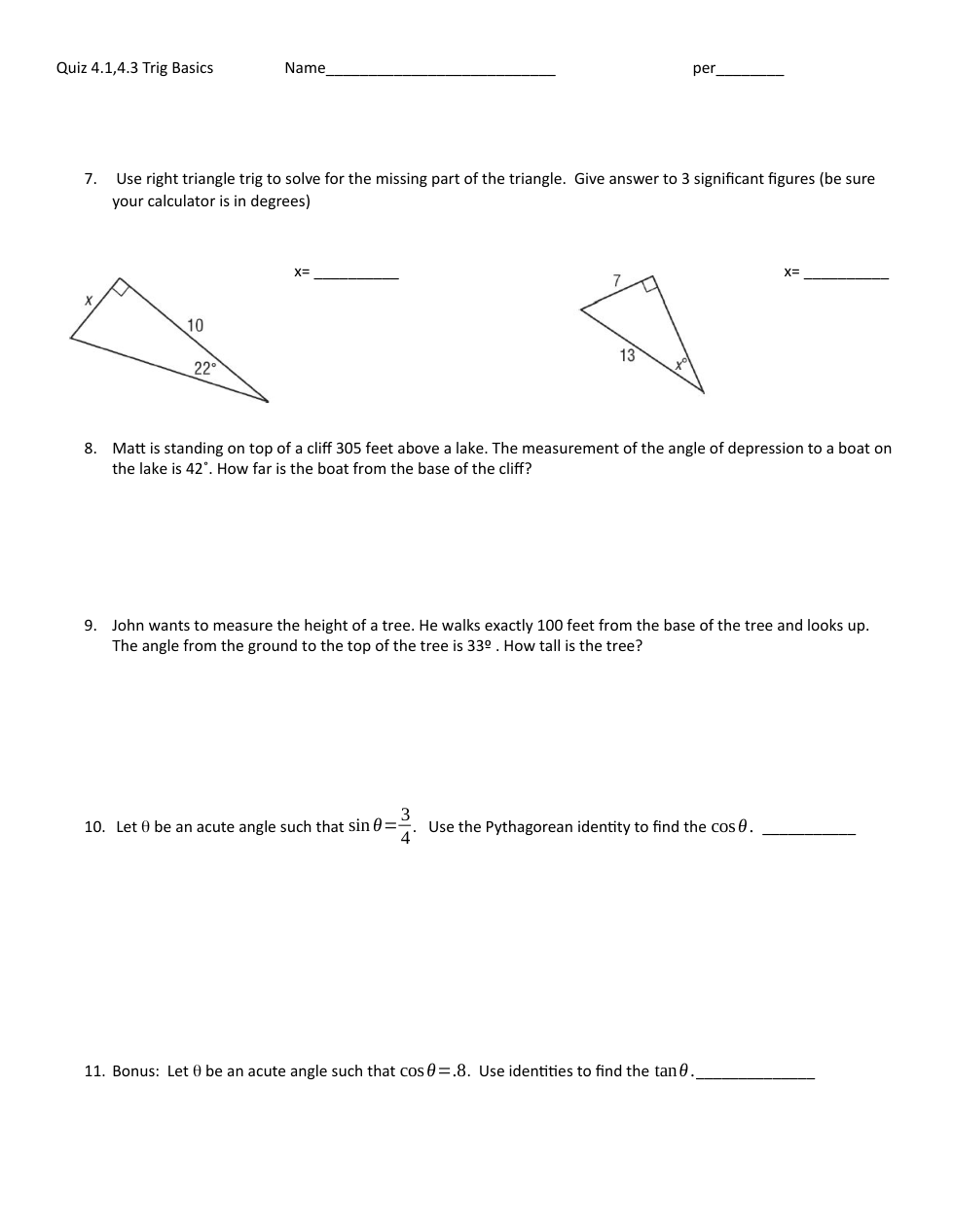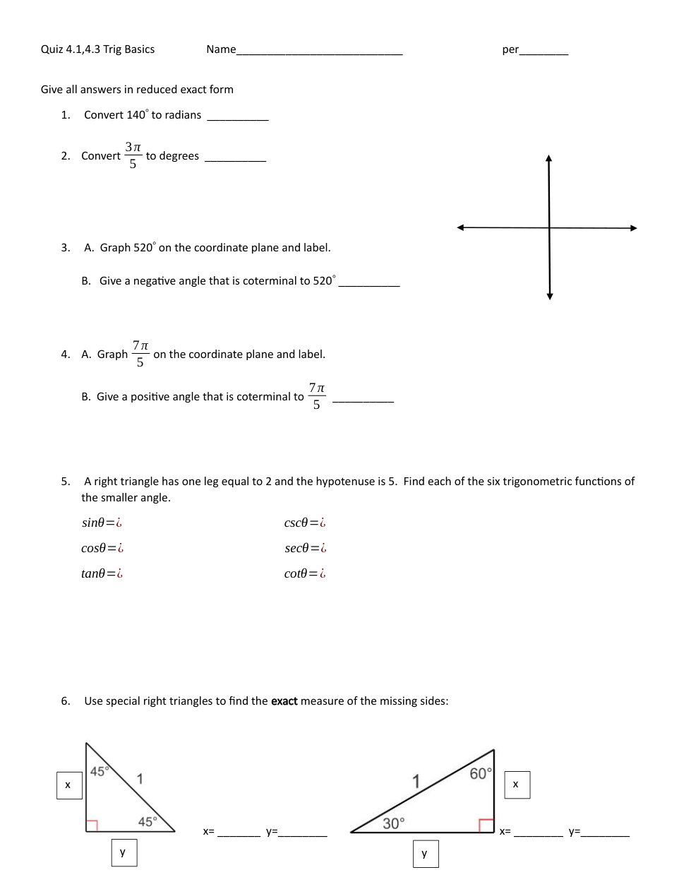 QUIZ 4.1,4.3 ANGLE MEASURE AND RT TRIANGLE TRIG