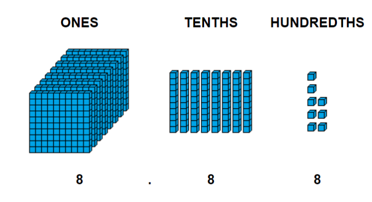 The model below shows the number 8.88. Using the model of 8.88, how does the 8 in the hundredths place compare to the 8 in the place to its left?