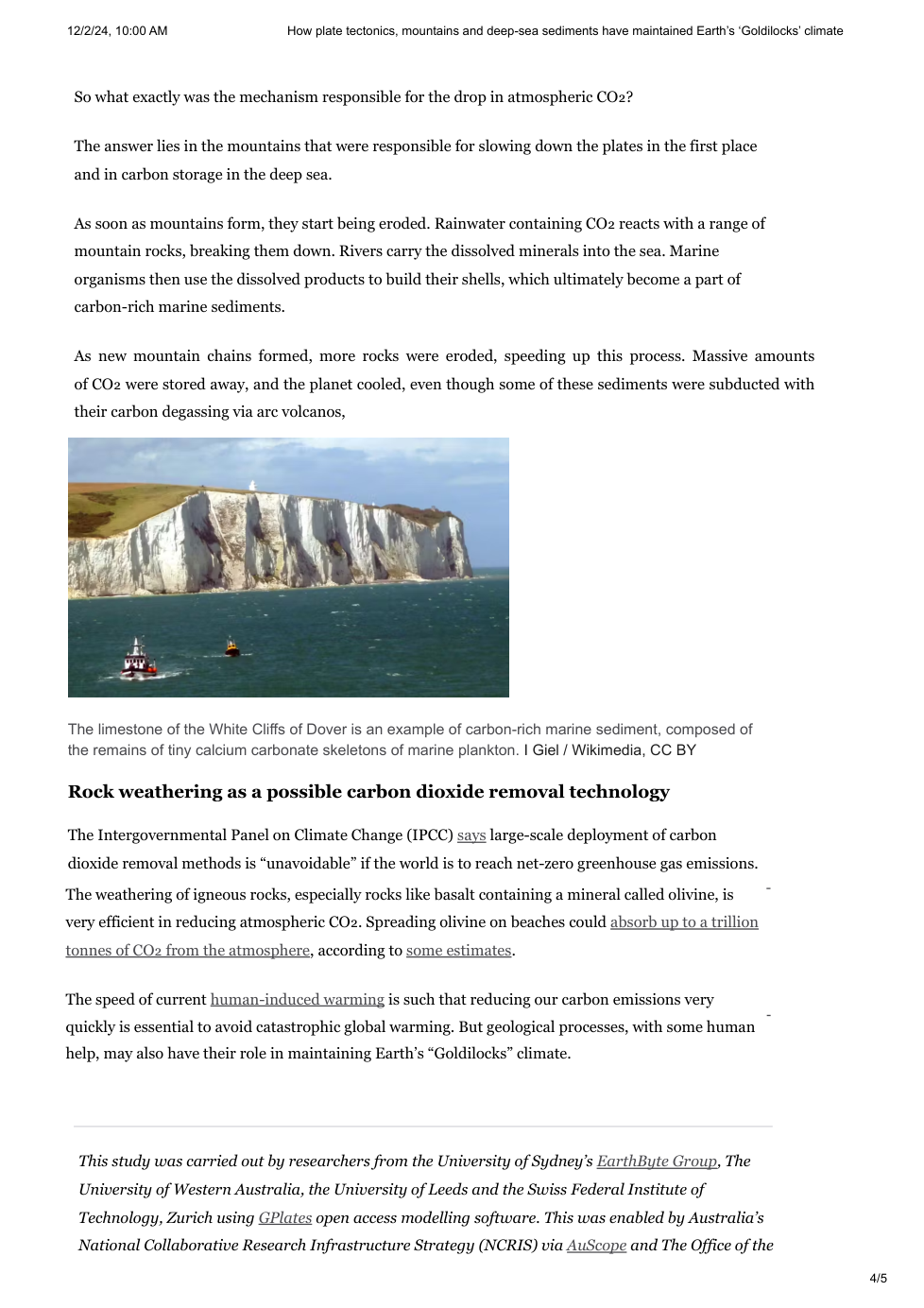 Summarize the model presented in the article for why atmospheric carbon dioxide decreased during the Cenezoic Era. (You should have two major mechanisms)