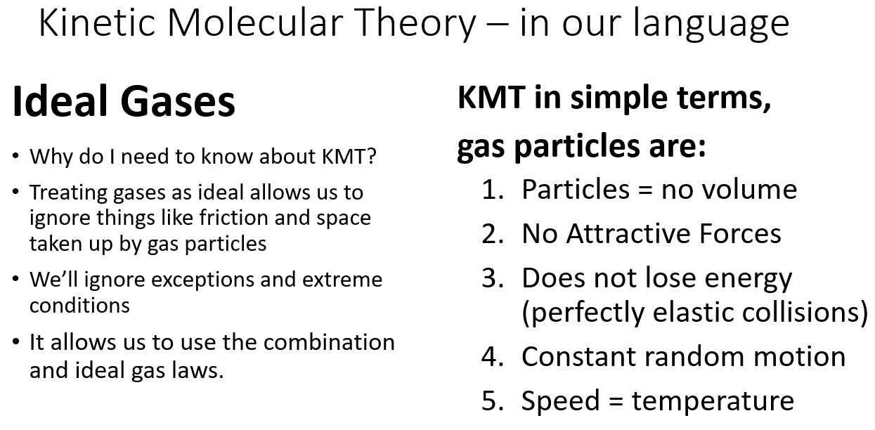 The Kinetic Molecular Theory (KMT) helps us understand and predict how gases behave in different situations by explaining important concepts like: