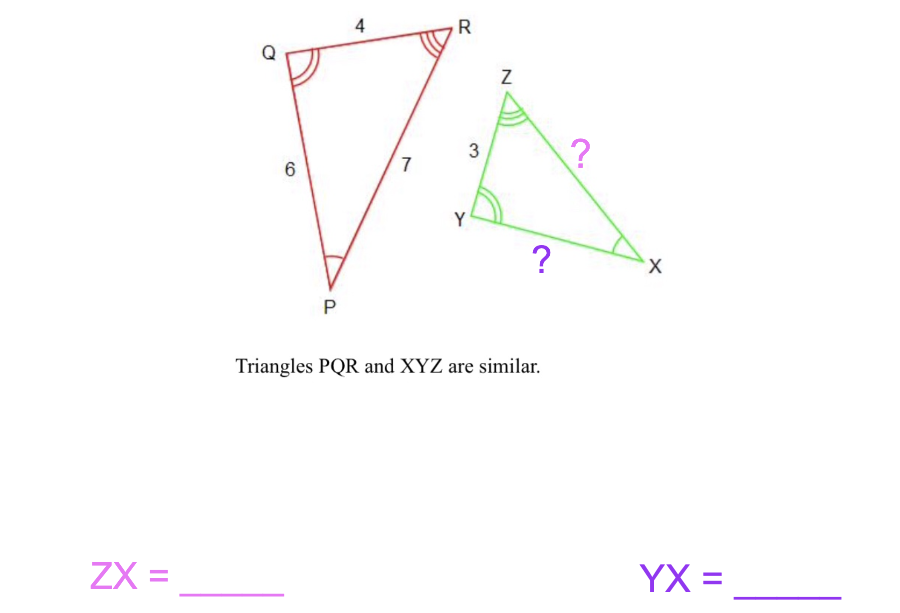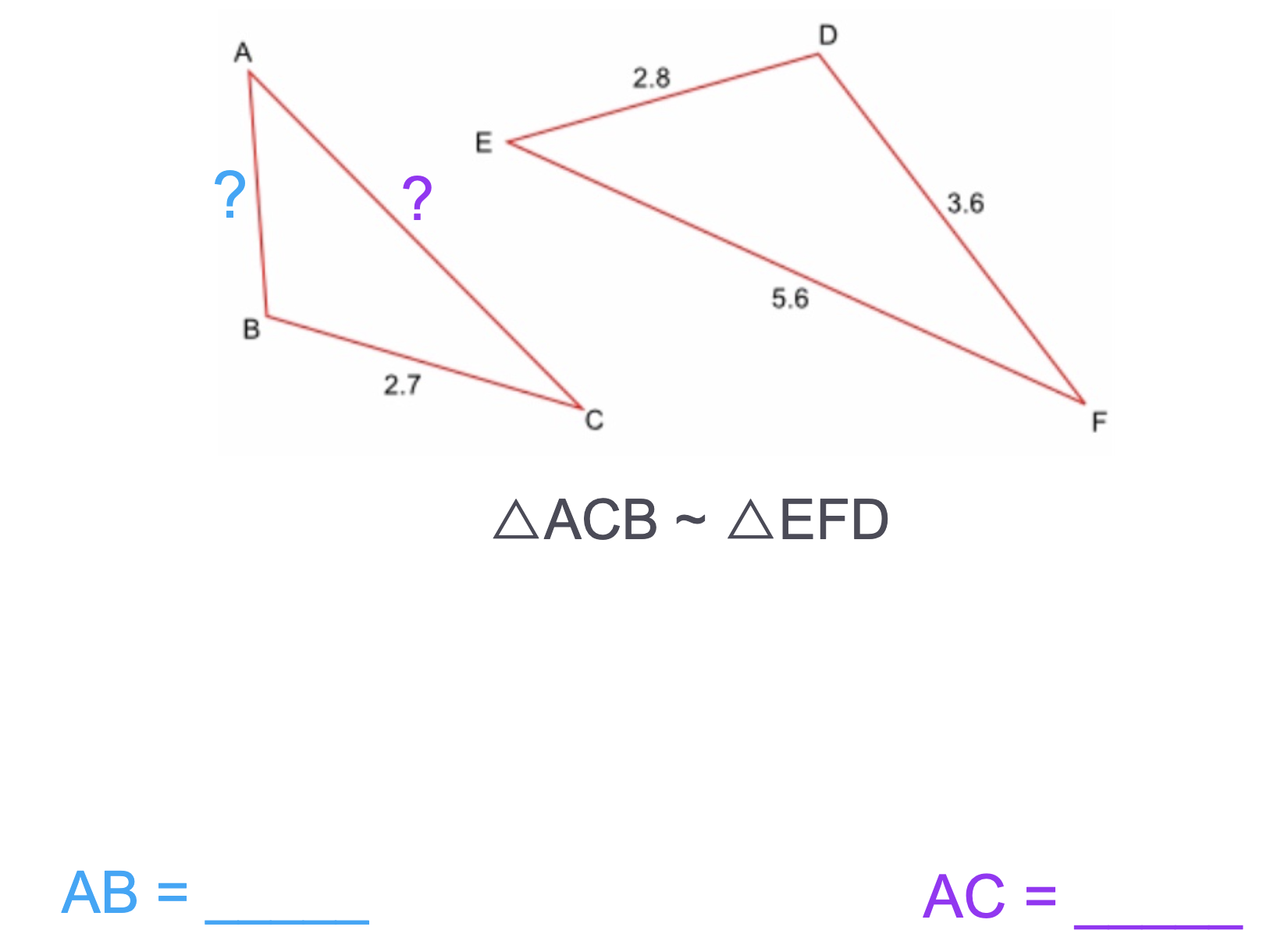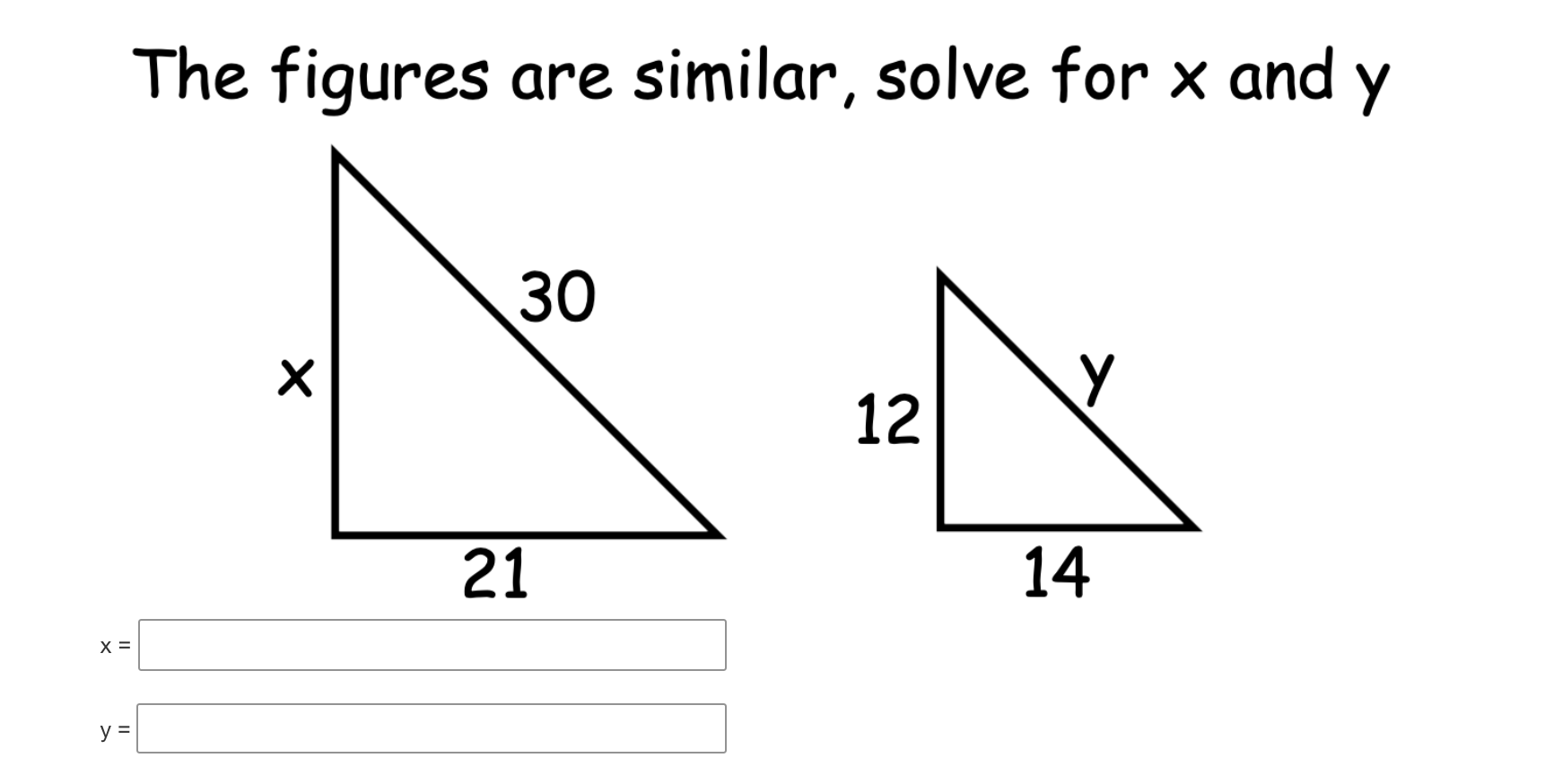 Why are the triangles similar? Answer this in the Show your work box. Then find the missing side, x and put your answer in the reply box.