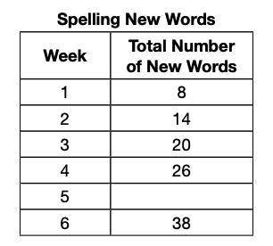 The table below shows the total number of new words he has learned to spell by the end of each week.