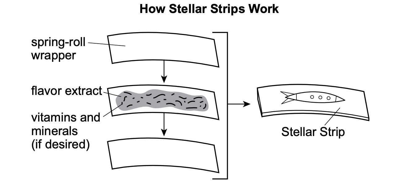 Stellar Strips are made from three layers of thin spring-roll wrappers, which are layered like tiny sandwiches: two plain sheets surround one that’s doused in tasty liquids. Different fillings can yield different flavors, like sweet, spicy, and barbecue. Vitamins could even be added.