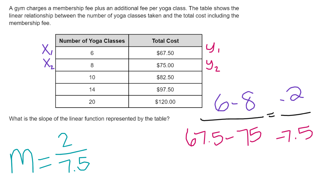 When these data are graphed on a coordinate grid, the points all lie on the same line. What are the slope and y-intercept of this line?