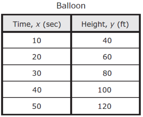 A hot-air balloon is released at ground level, and it rises into the air at a constant rate. After 5 seconds of the height of the balloon is 20 feet. The balloon continues to rise at the same rate.