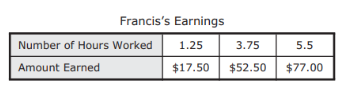 The table shows the linear relationship between the number of hours Francis worked, x, and the amount of money Francis earned, y.
