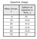 The table shows the number of gallons of gasoline in a car’s gas tank after the car has been driven x miles.