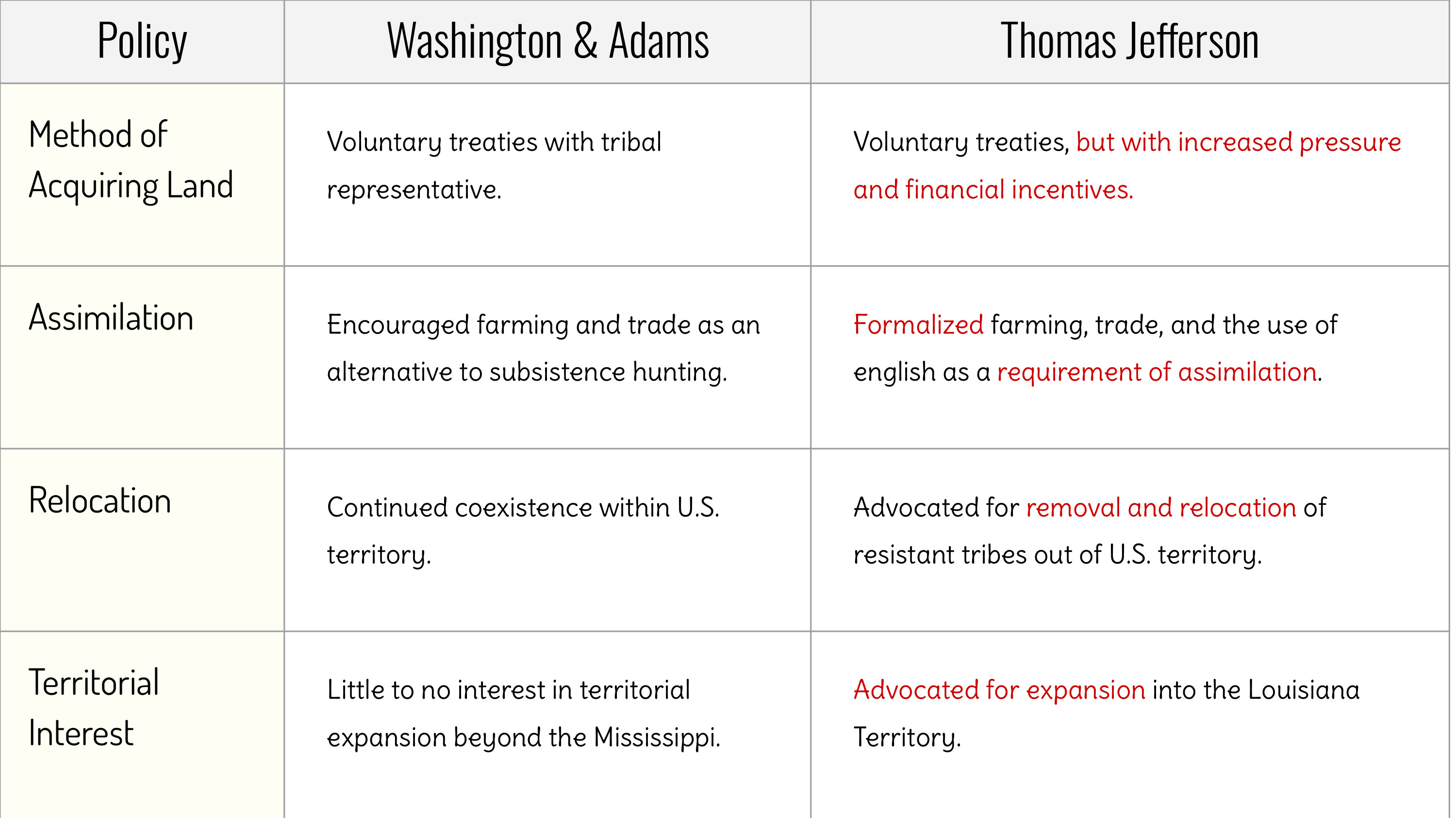 According to the chart, how did Jefferson's policy differ from Washington and Adams regarding cultural assimilation?