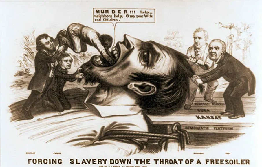 What message is conveyed by the political cartoon (document 2) titled "Forcing Slavery Down the Throat of a Free Soiler"?