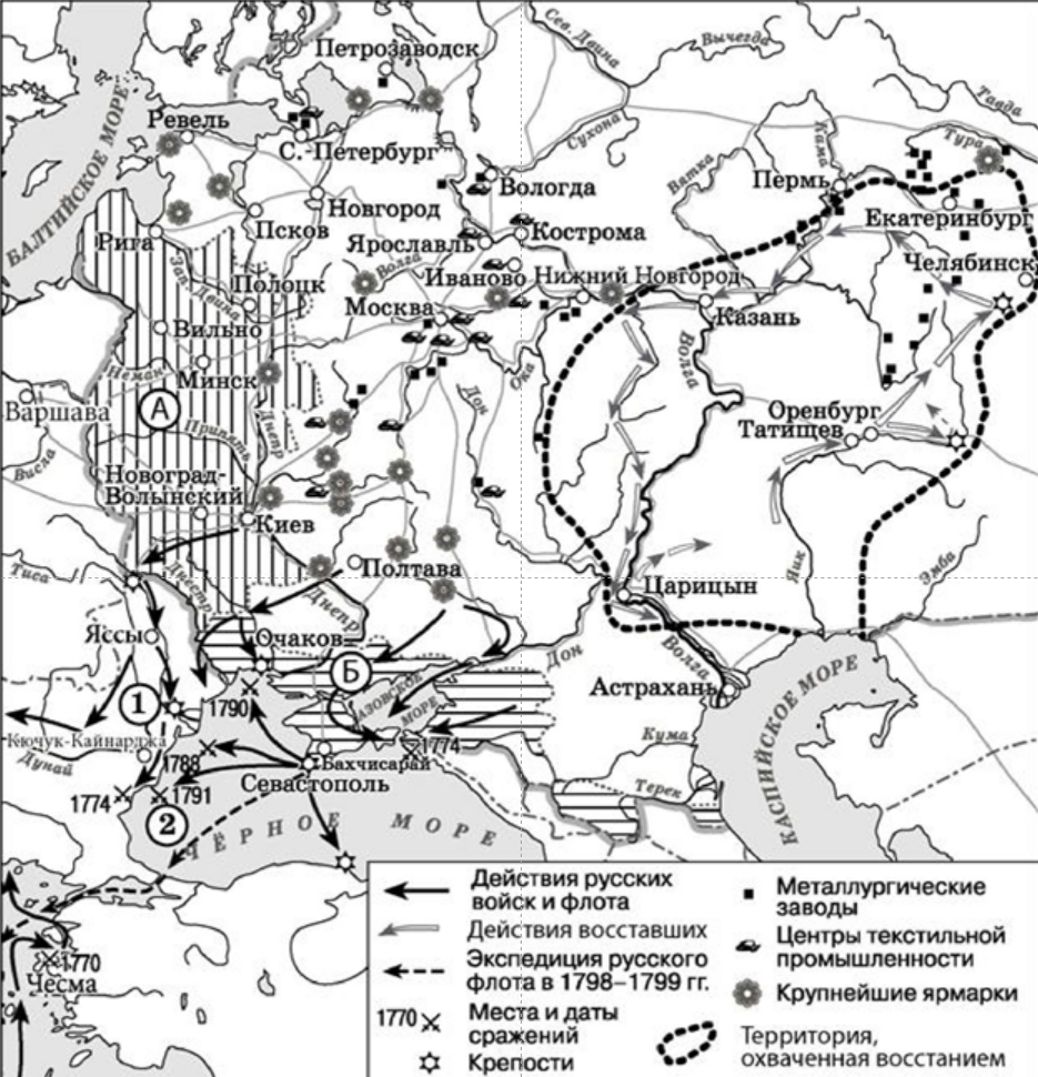 11. Какие суждения, относящиеся к событиям, обозначенным на схеме, являются верными?1) На территории народного восстания, обозначенного на схеме, находились металлургические заводы.2) В период обозначенных на схеме событий русское влияние в Закавказье усилилось.3) В штурме крепости, обозначенной на схеме цифрой «1», участвовал М.И. Кутузов.4) Одна из крупнейших ярмарок, обозначенных на схеме, находилась на берегу Волги.5) Предводителем обозначенного на схеме восстания был казачий атаман К.А. Булавин.6) Все обозначенные на схеме походы и экспедиции российского флота были предприняты в годы правления одного монарха.