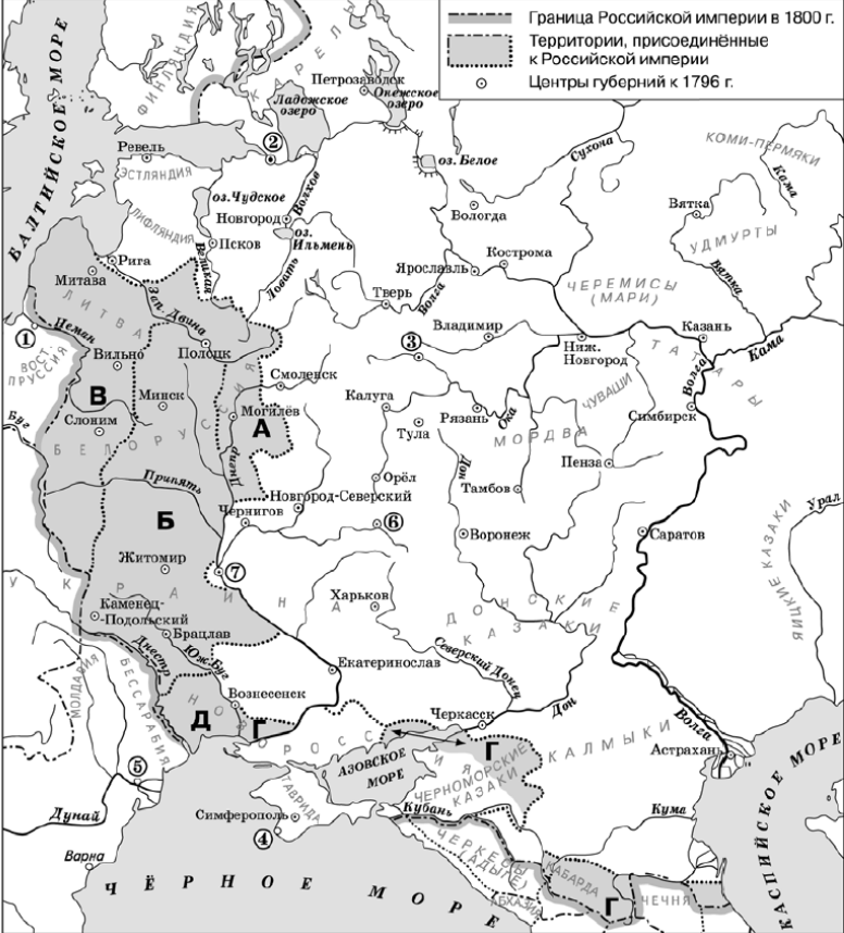 11. Какие суждения, относящиеся к событиям, обозначенным на схеме, являются верными?1) Буквой «Б» на схеме обозначена территория, отошедшая к России в результате второго раздела Речи Посполитой.2) В городе, обозначенном цифрой «3», в 1825 г. произошло восстание декабристов.3) Один из городов, показ анных на карте, являлся до 1783 г. столицей Крымского ханства.4) Территория, обозначенная на схеме буквой «Д», была присоединена к России в 1774 г.5) Цифрой «4» на схеме обозначен город, который стал главной базой Черноморского флота.6) Возле города, обозначенного цифрой «7», был открыт Царскосельский лицей.