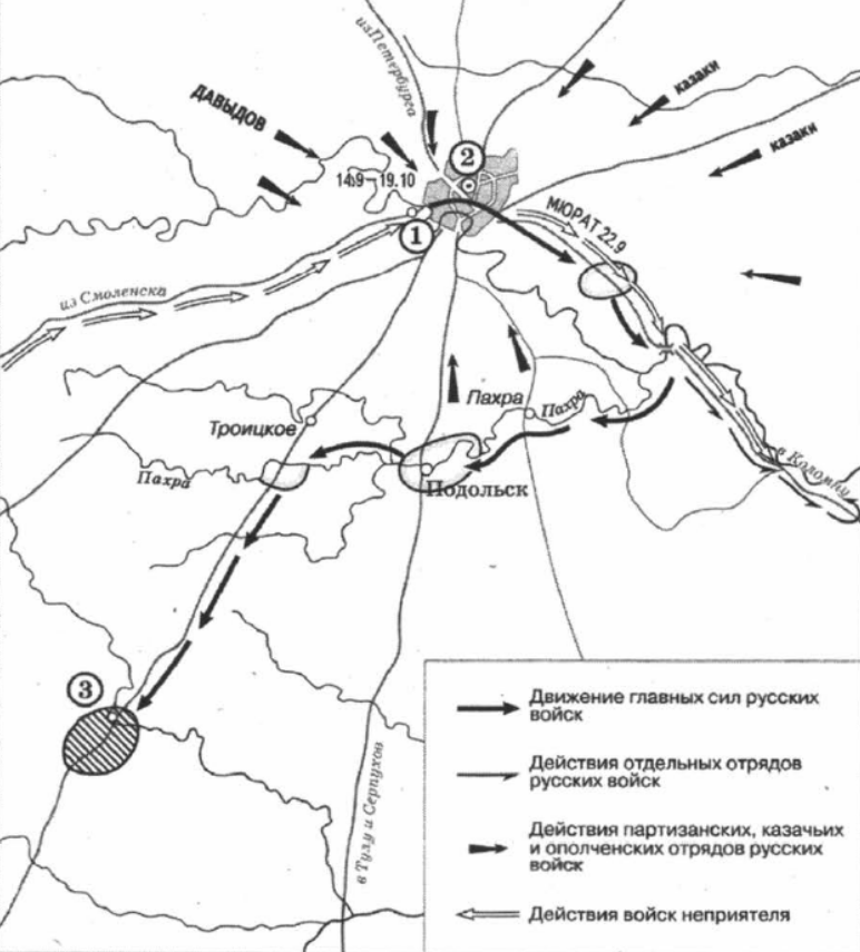 1) В селе, обозначенном на схеме цифрой «1», состоялся военный совет, решение которого определило ход дальнейших военных действий.