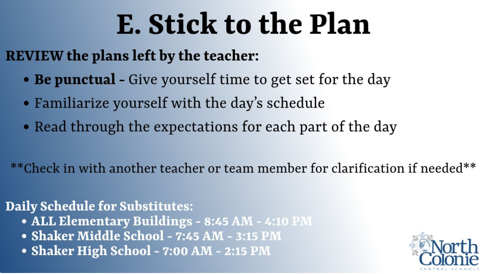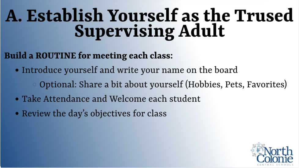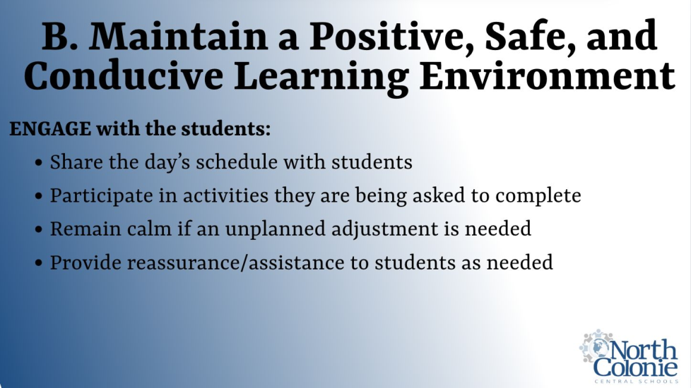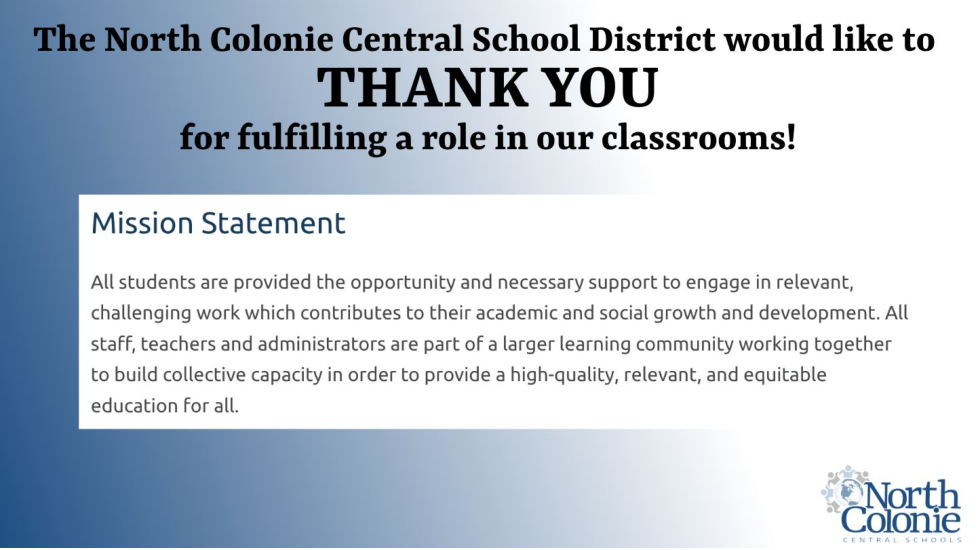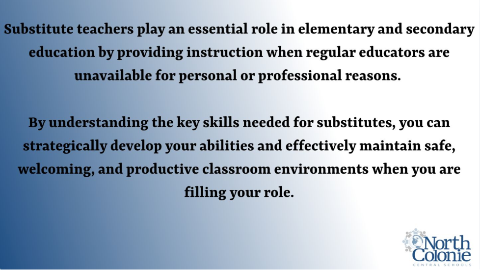 The following training course is designed to support your new role as a Substitute Teacher in the North Colonie Central School District. As you work through the content, please keep the Mission Statement and our Four Pillars at the forefront of your learning.