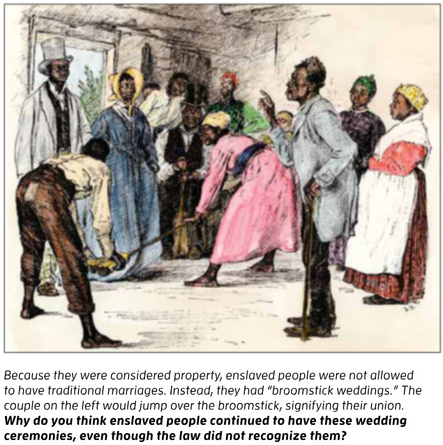 Many enslaved African Americans looked for ways to avoid despair. They did what they could to improve their lives. In the slave quarters, African Americans created communities. To restore peace after a long day’s work or to ease their sadness, they sang and played music on African instruments similar to the banjo. They taught their children how to avoid punishment. They told stories of Africa and created new stories about their lives in the South. Couples held their own wedding ceremonies, even though the laws did not recognize these marriages.