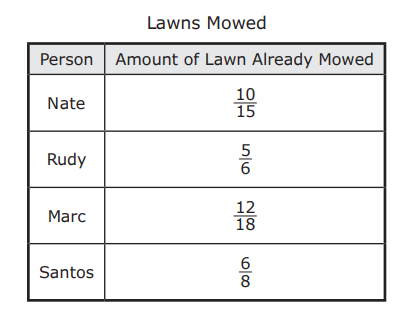 Four people are mowing their lawns. The table shows the fraction of each lawn that has already been mowed by each person.