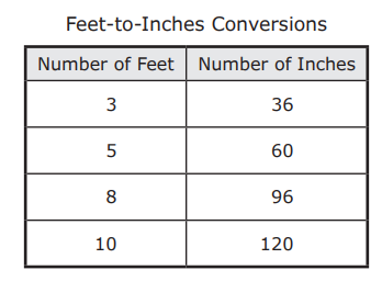 The table shows numbers of feet and the equivalent numbers of inches.