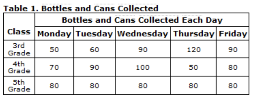 Table 1 shows how many bottles and cans each grade collected on each day of the week.