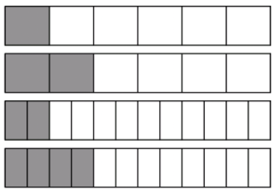 Anna is using four models to compare fractions. She shades each rectangle to represent a fraction of a whole.