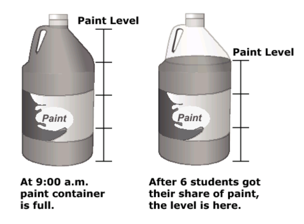 When the class went to the Painting Station at 9:00 a.m., the container of paint was completely full. After 6 of the 24 students got their share of paint, the paint level had dropped to the level shown in the following picture.