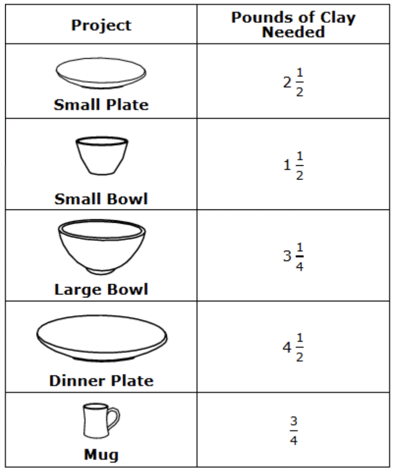 Lizzie and Zela are interested in making pottery. The following chart shows how much clay is needed to make different projects.