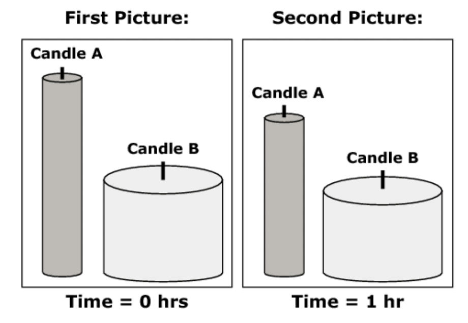 She takes a picture, lights the candles, and then lets them burn for 1 hour. She then takes a second picture. You can assume that each candle burns at the its own constant rate.