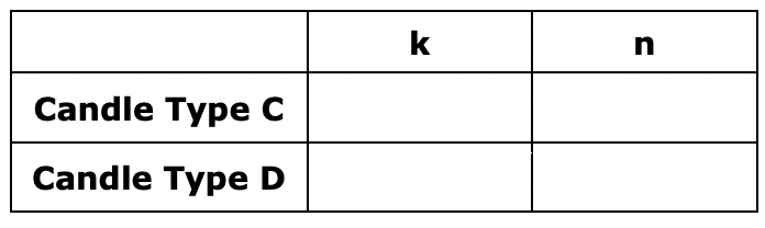 Fill in the blanks to complete the table to show two possible sets of values for k and n for your new candle designs.