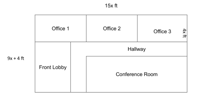 Office 1 and Office 2 have the same dimensions, 6x ft by 4x ft.